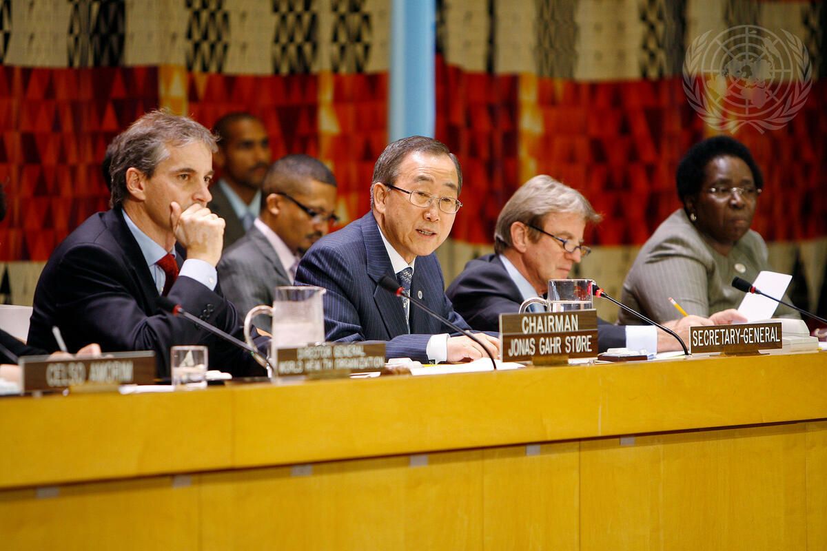Secretary-General Ban Ki-moon (second from left), flanked by Jonas Gahr Store (left), Minister for Foreign Affairs of Norway; Bernard Kouchner (second from right), Minister for Foreign Affairs of France; and Nkosazana Zuma-Dlamini (right), Minister for Foreign Affairs of the Republic of South Africa, addresses the launch of the Foreign Policy and Global Health Initiative.