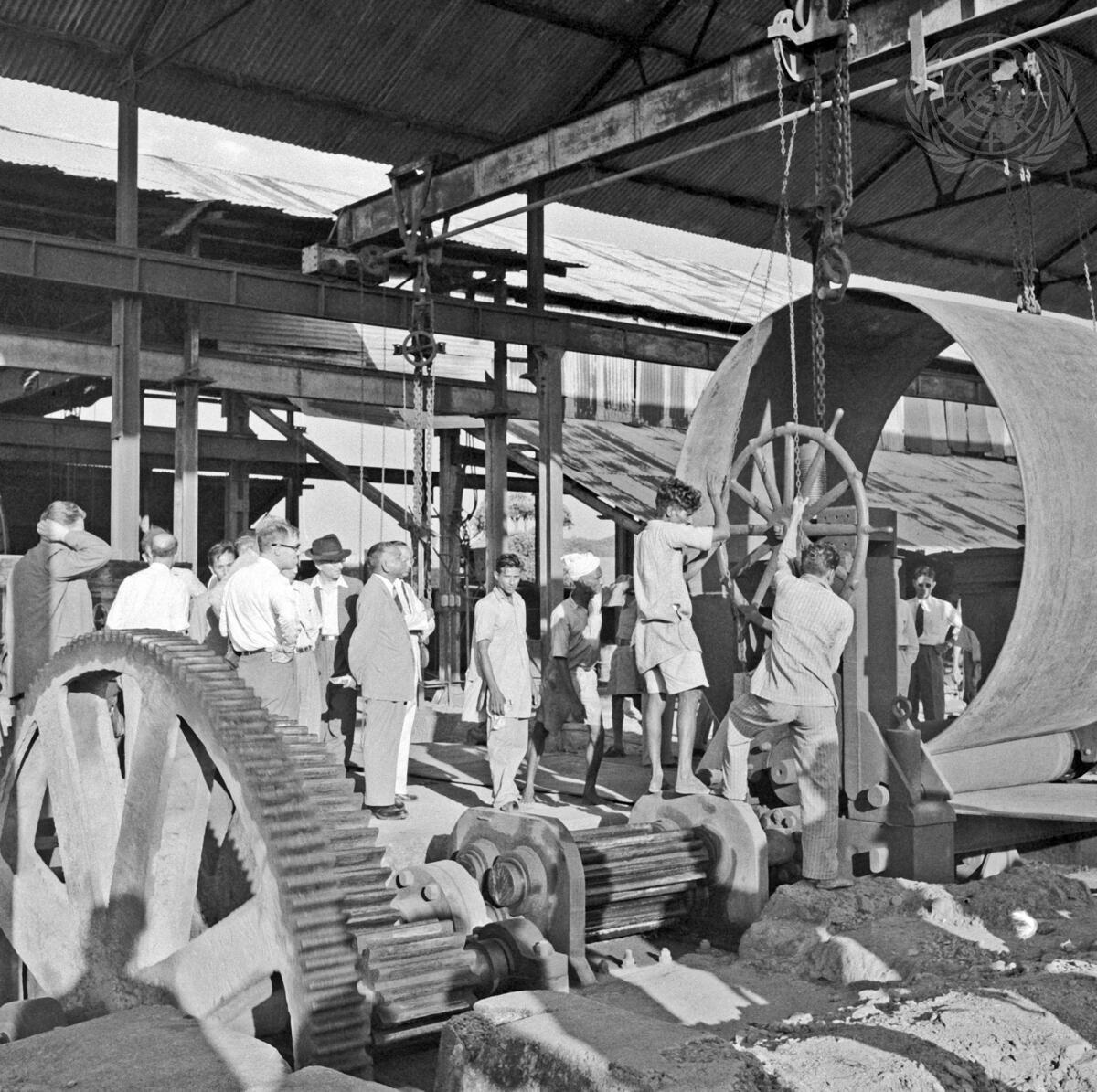 A picture taken during the trip, as the experts were visiting the power station and pipe works of the Mahatma Gandhi hydro-electric project, in the north-eastern corner of Mysore State.