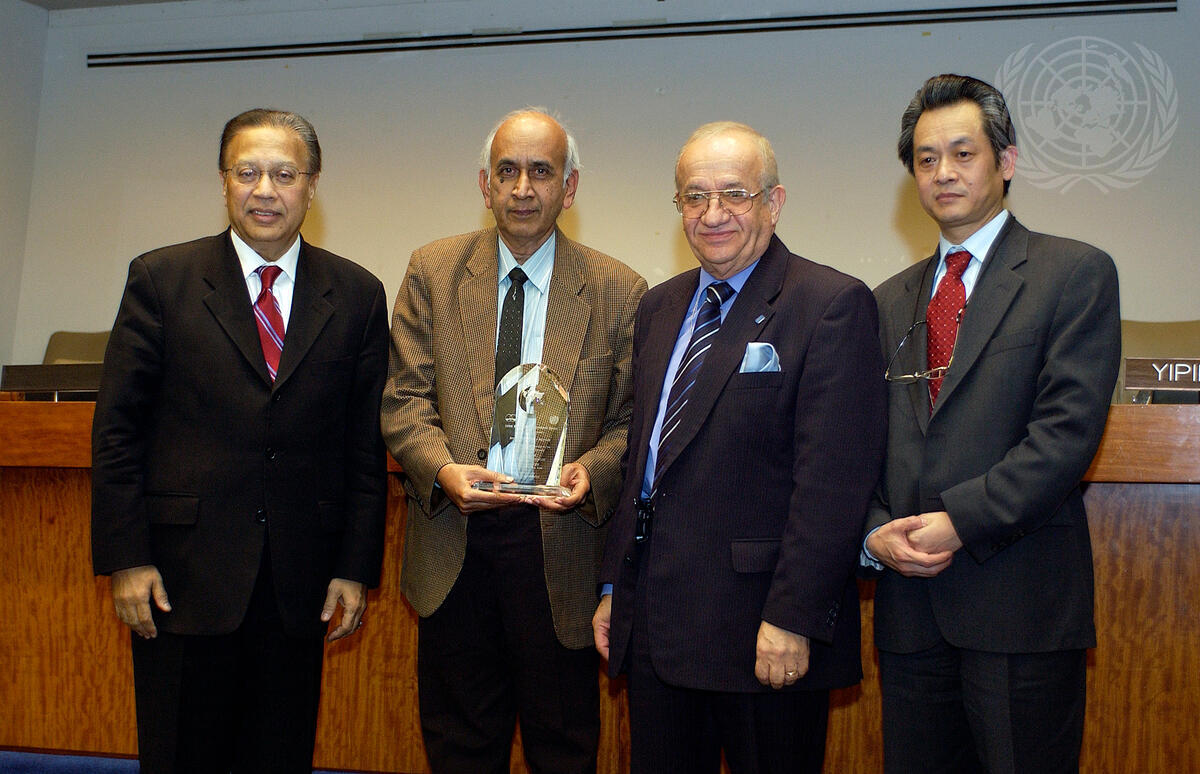A South-South Cooperation Partnership Award recipient Raghavan Rajagopala, member of the Governing Board of the International Ocean Institute, with (from left to right): Anwarul K. Chowdhury, Under-Secretary-General and High Representative for the Least Developed Countries, Landlocked Developing Countries and Small Island Developing States; Raghavan Rajagopala; Awni Behnam, President of the International Ocean Institute; and Yiping Zhou, Director, Special Unit for South-South Cooperation, UNDP, at UN Headquarters in New York.