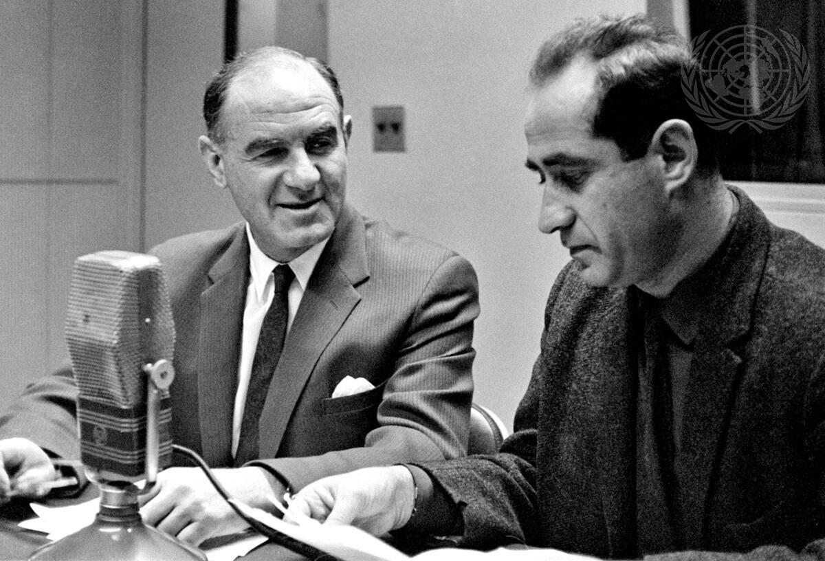 The United Nations maintains radio services whose programmes are directed towards many parts of the world. Itzhak Golan (right), radio correspondent for KOL Israel, is seen here interviewing, for a UN radio programme, Michael S. Comay (left), Permanent Representative of Israel to the United Nations.