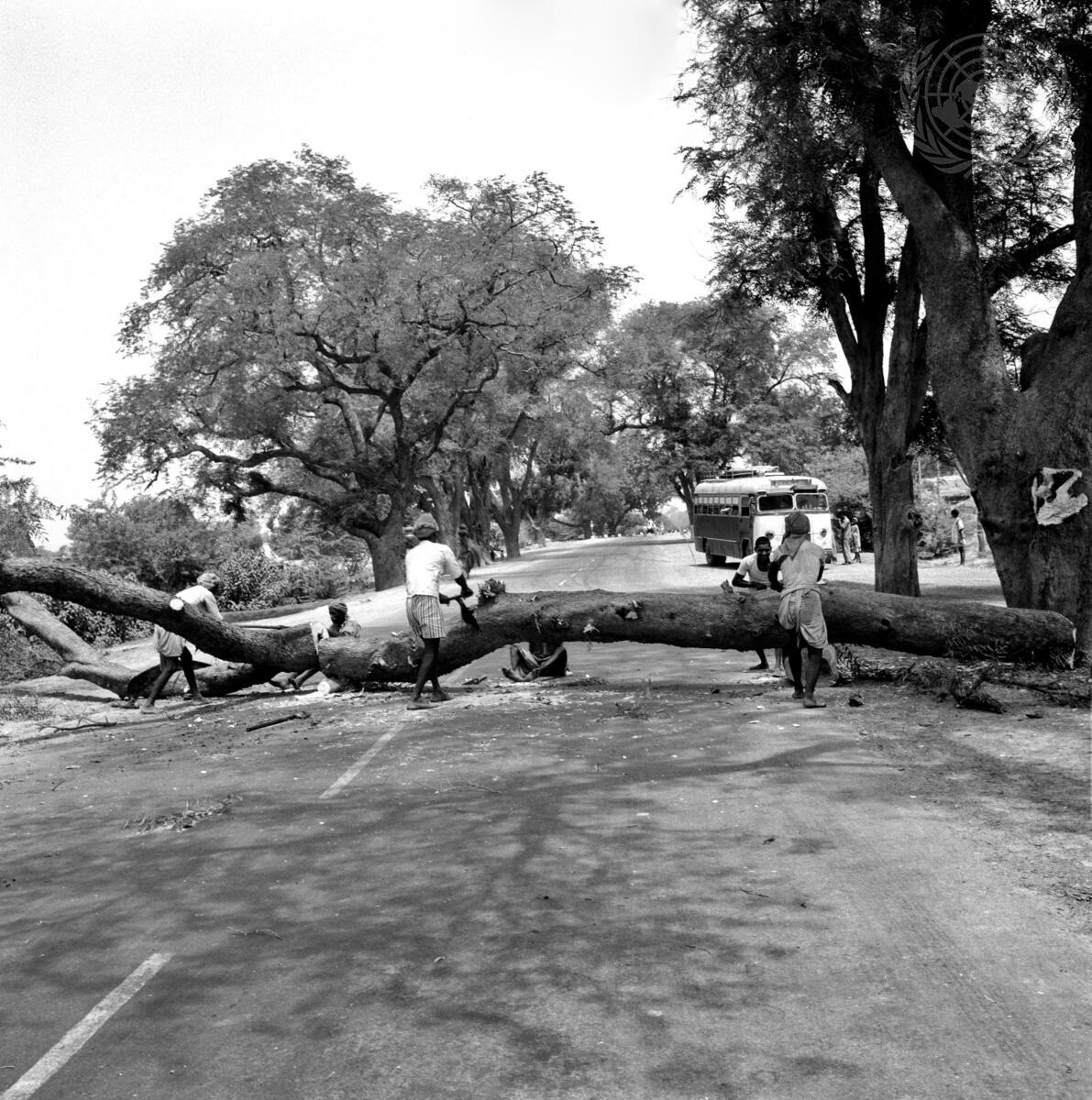 Workers sawing a large tree trunk obstructing traffic on A-1 route of the Asian Highway near Agra, India. [No exact date]