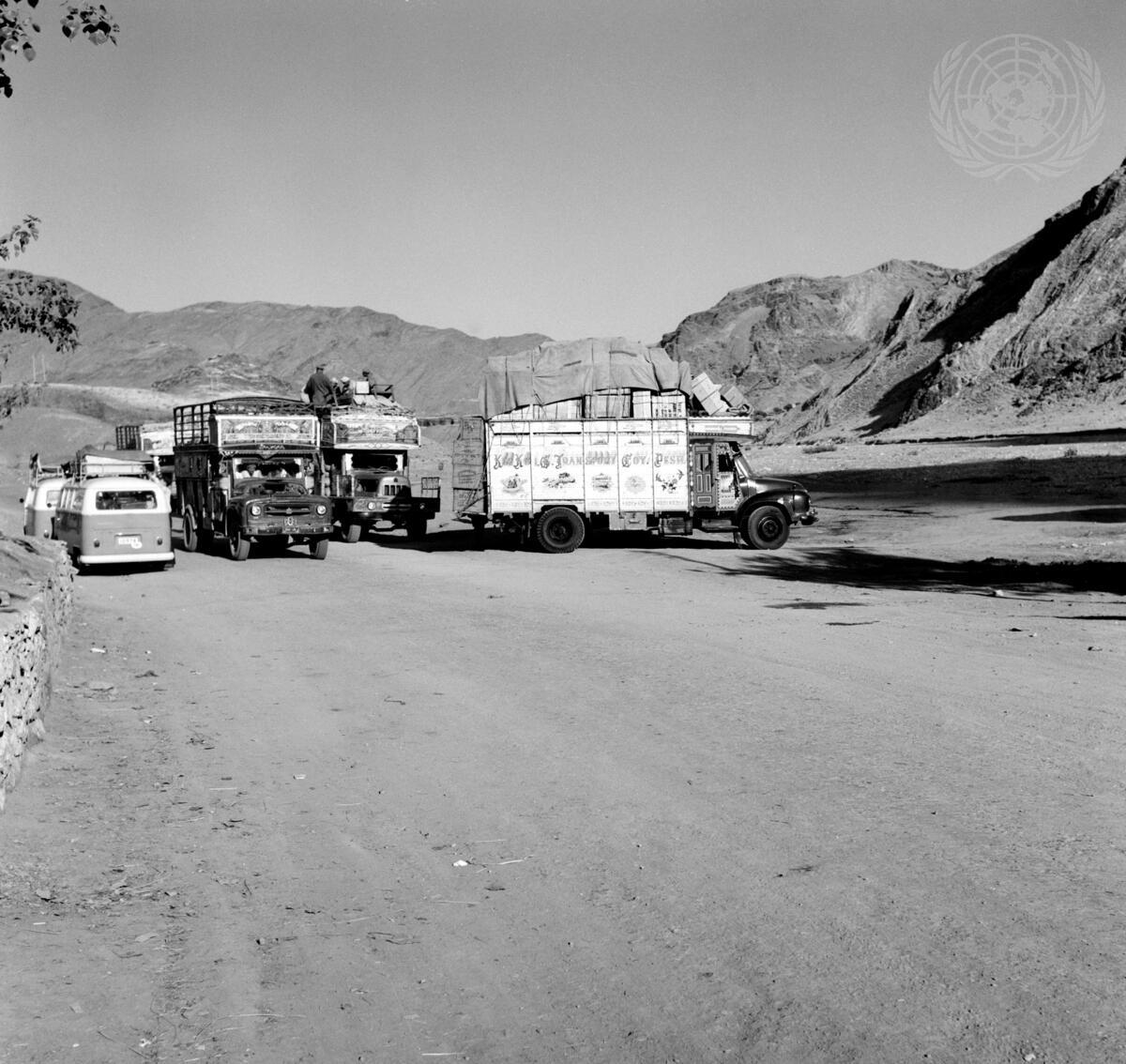 Trucks at the Pakistan and Afghanistan border near the Khyber Pass.