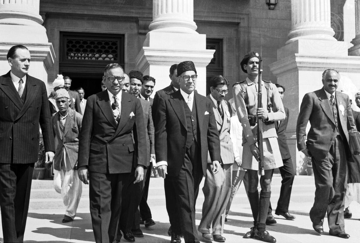 Mr. Liaquat Ali Khan, Prime Minister of Pakistan (center), and Dr. P.S. Lokanathan, (at right), Executive Secretary of ECAFE, leaving the Assembly Building after the inaugural meeting.