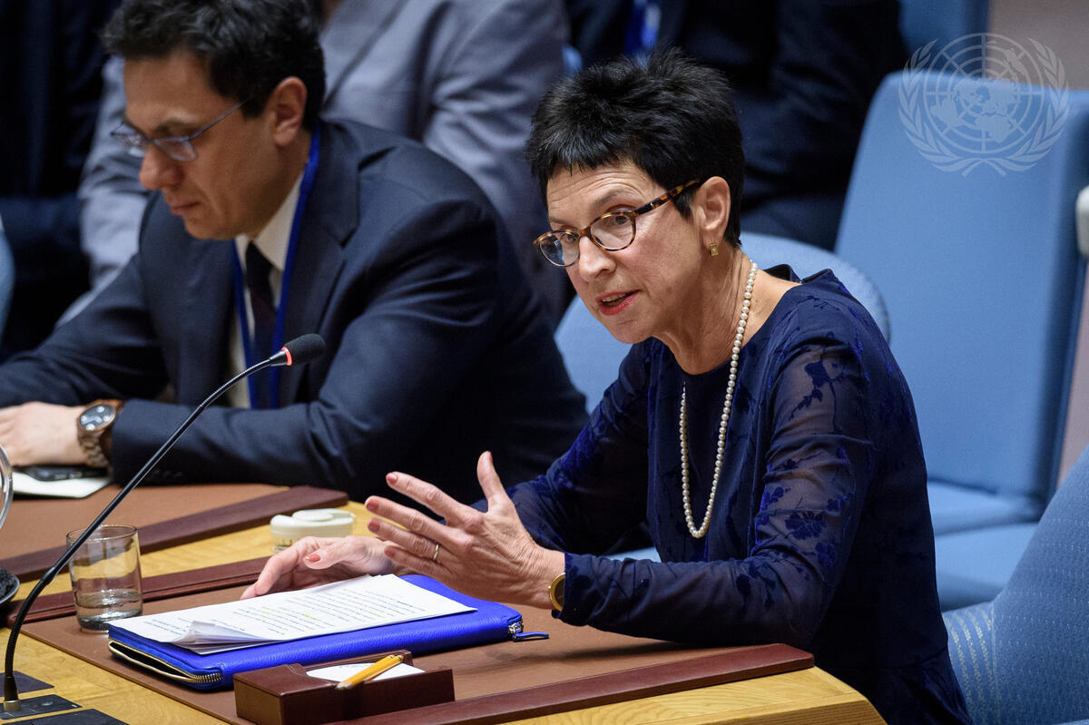 Ursula Mueller (right), Assistant Secretary-General for Humanitarian Affairs and Deputy Emergency Relief Coordinator, addresses the Security Council meeting on Syria.