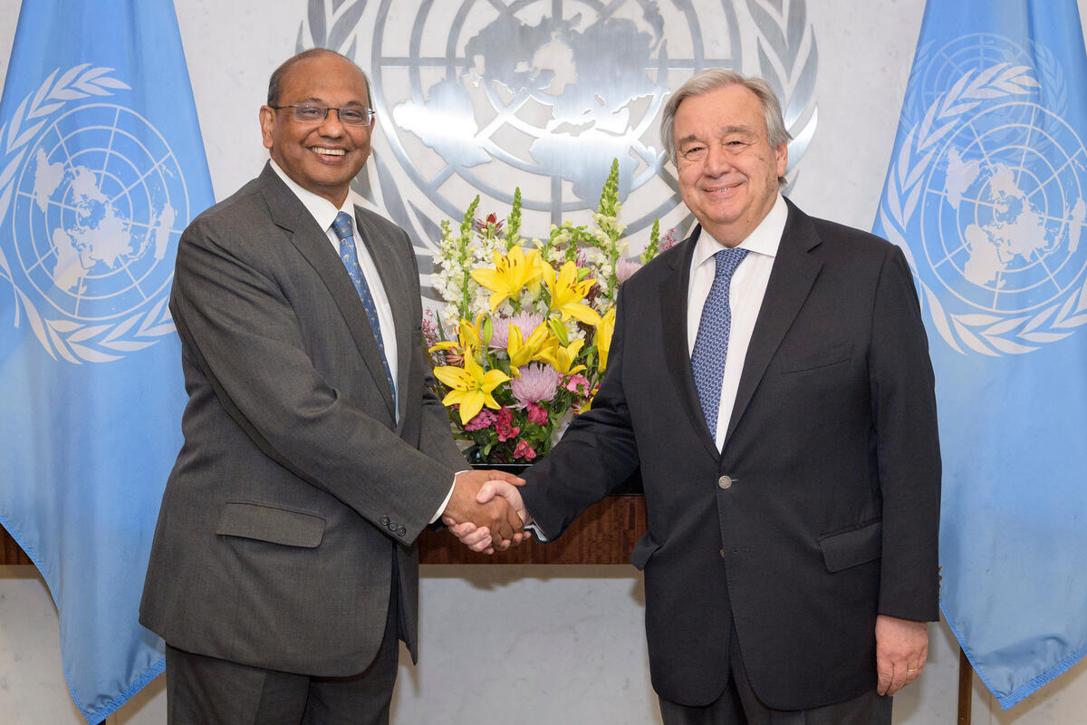 Secretary-General António Guterres (right) meets with Ajay Mathur, Director General of the Energy and Resources Institute.