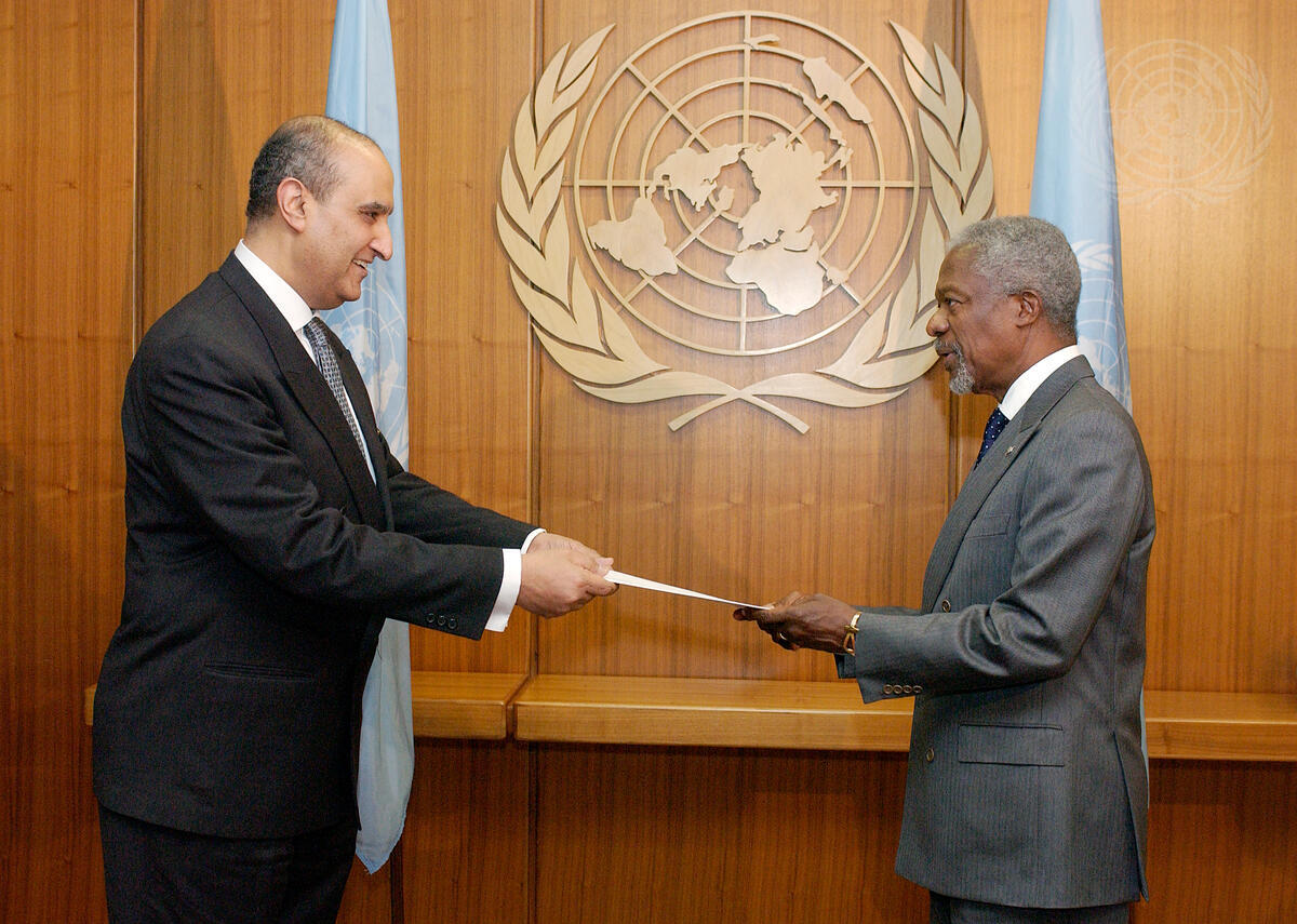 Maged Abdelfattah Abdelaziz (left), the new Permanent Representative of the Arab Republic of Egypt to the United Nations, presents his credentials to Secretary-General Kofi Annan.
