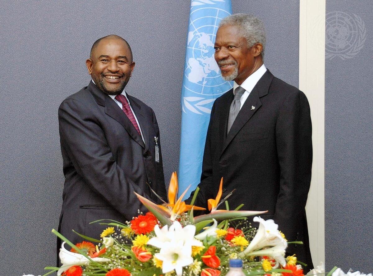 Secretary-General Kofi Annan (right) meets with Azali Assoumani, President of the Comoros, during the International Meeting for the ten-year review of the Barbados Programme of Action for the Sustainable Development of the Small Island Developing States in Port-Louis, Mauritius.