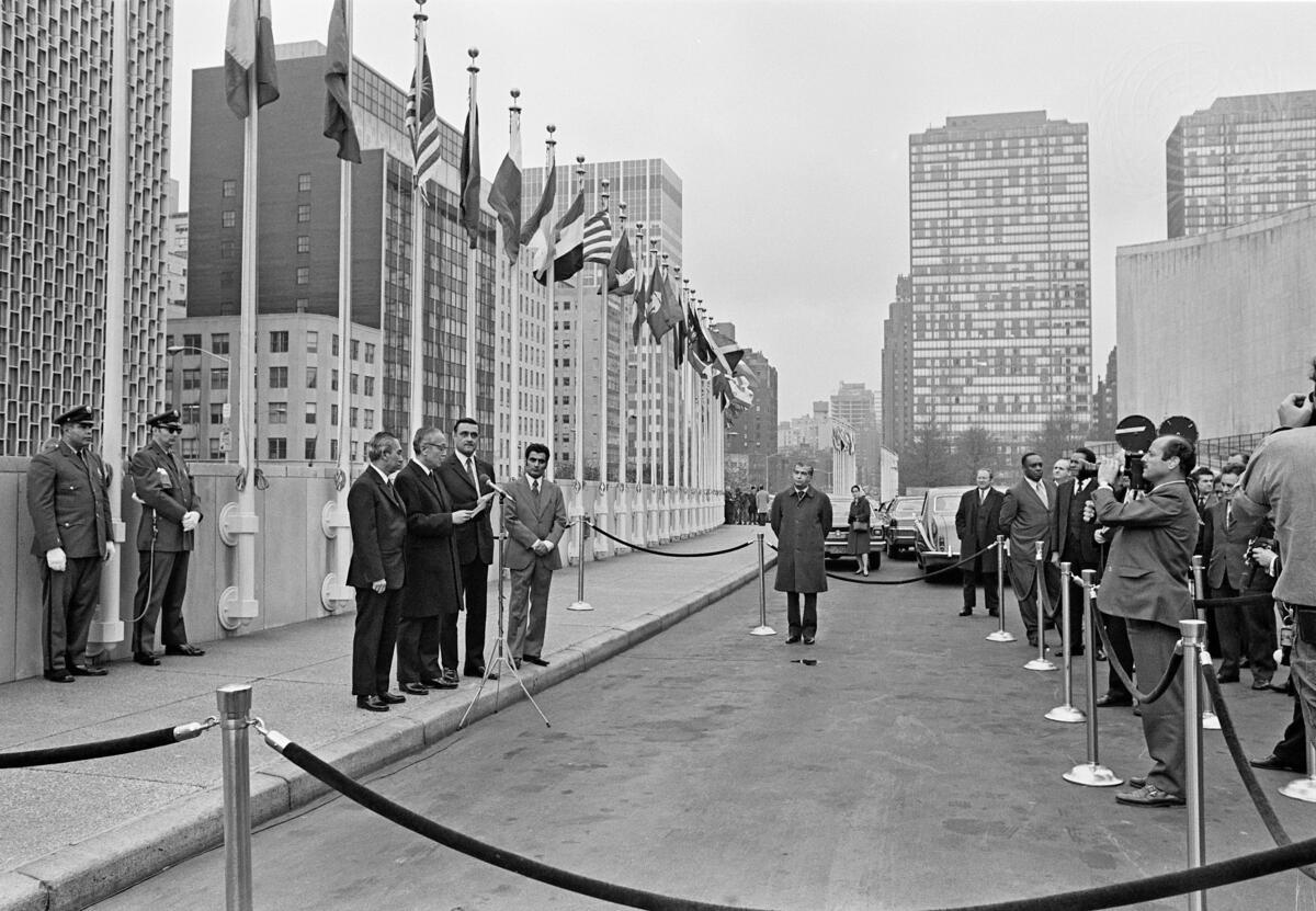Secretary-General U Thant (second from left by microphone) reads a statement prior to the raising of the flag of the United Arab Emirates.