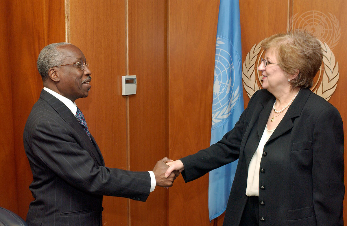 Deputy Secretary-General Louise Fréchette (right) meets with Yvon Siméon, Minister for Foreign Affairs of Haiti.