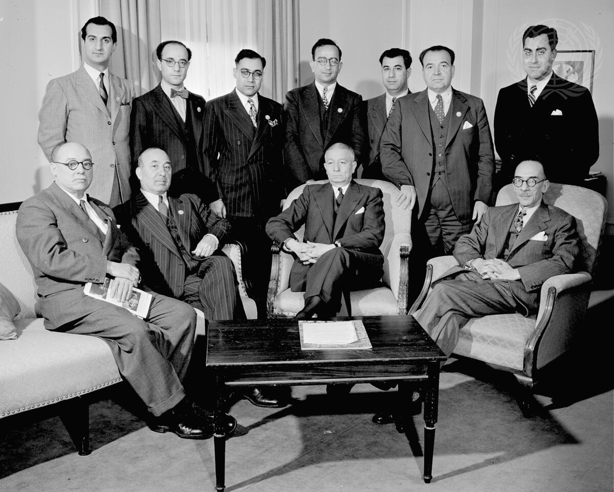 Iraq Chairman, Arshad Al-Omari, seated centre, and members of the Iraqi Delegation. Standing (left to right): Mohammed Adham, Haschim Jawad, Dr. Mejid Abbas, Dr. Abde-Ul-Jabbar Chalabi, Thomas Mansy, Darwish Al-Haidari, and Baha Awani; Seated (left to right): Judge H.I. Lloyd, Ali Jawdat, Arshad Al-Omari, and Nasrat Al-Farsy. [25 April - 26 June 1945]