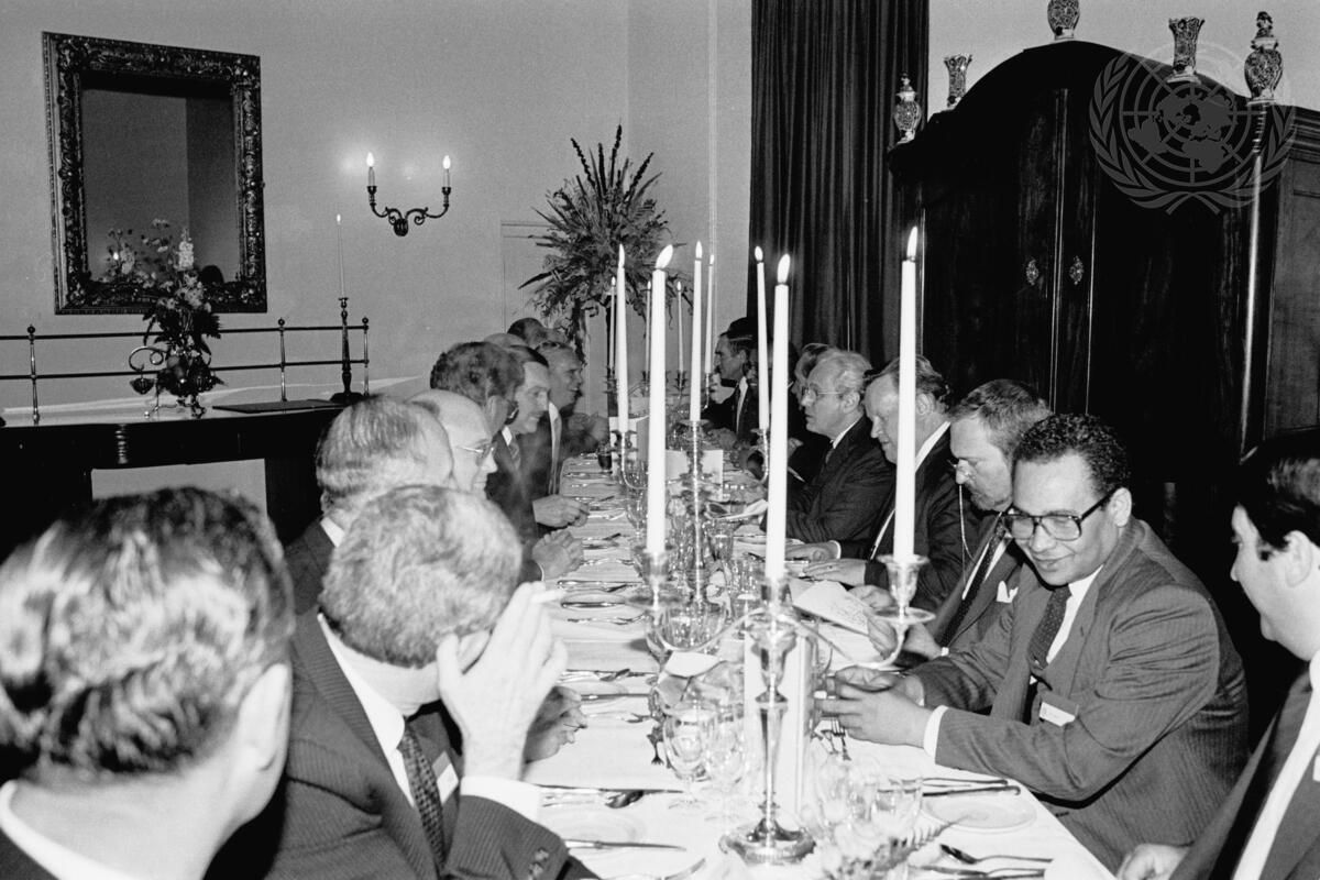 The UN officials at the dinner given by the South African Foreign Minister at the Alphen Hotel in Constantia. From the right are: Francois Giuliani, Spokesman for the SG; Hisham Omayad, Senior Political Advisor to the SG's Special Representative for Namibia; and Secretary-General Javier Perez de Cuellar. In front of the Secretary-General is Foreign Minister Roelof F. Botha of South Africa.