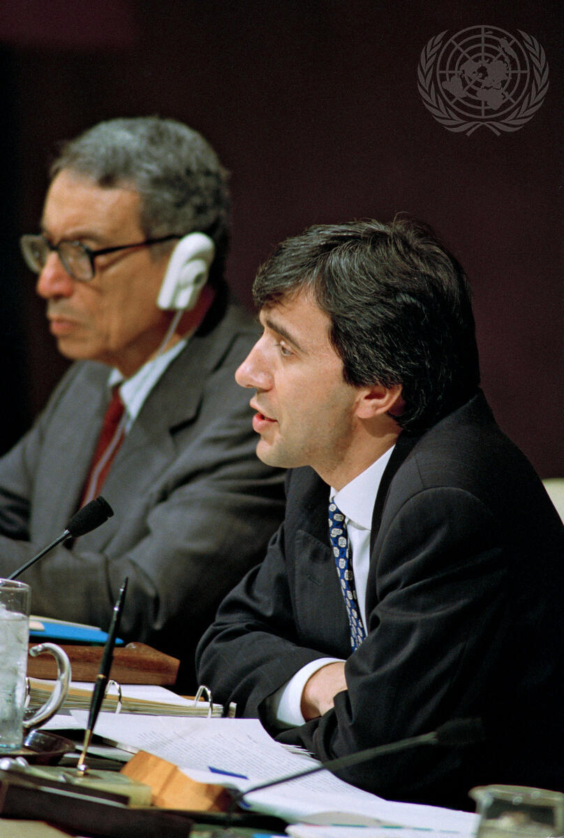 Stoyan Ganev (right) of Bulgaria making his opening day statement as the new President of the 47th session of the General Assembly. To the left is Secretary-General Boutros Boutros-Ghali.