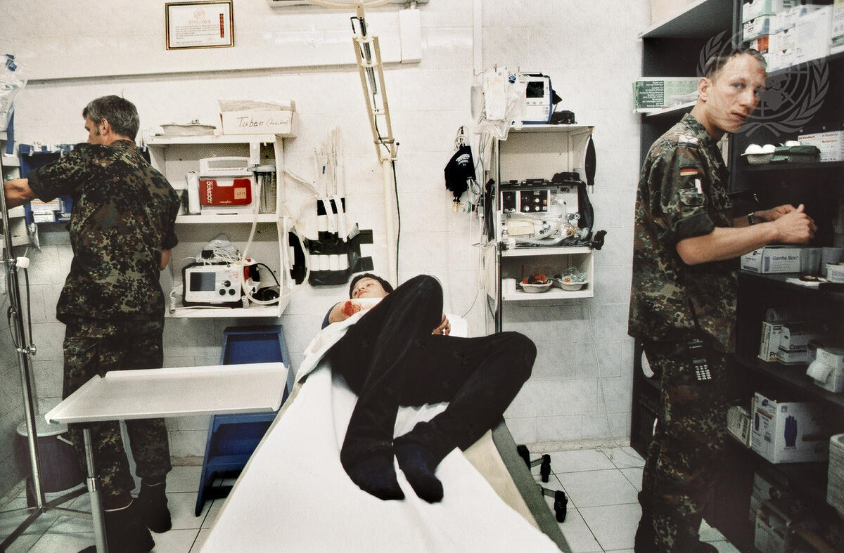 Maj. Heyo Weerts (left) and Maj. Frank Hengstermann (right), doctors serving the United Nations Observer Mission in Georgia (UNOMIG) medical team, give first aid treatment to a local resident in the Gali sector of Abkhazia region, Georgia.