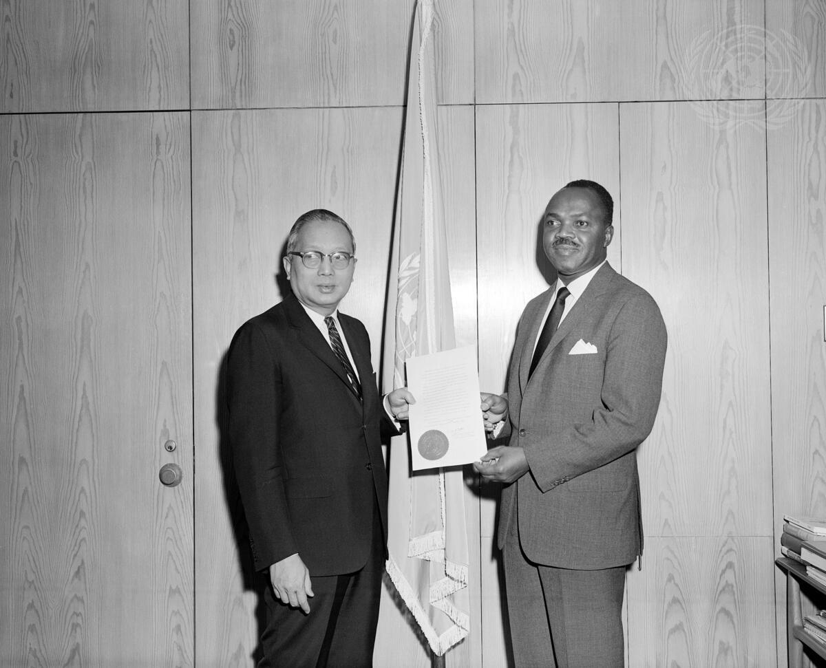 Mr. Eustace Adolphe Braithwaite (right), the new Permanent Representative of Guyana to the United Nations, presenting his credentials to Secretary-General U Thant at United Nations Headquarters today.