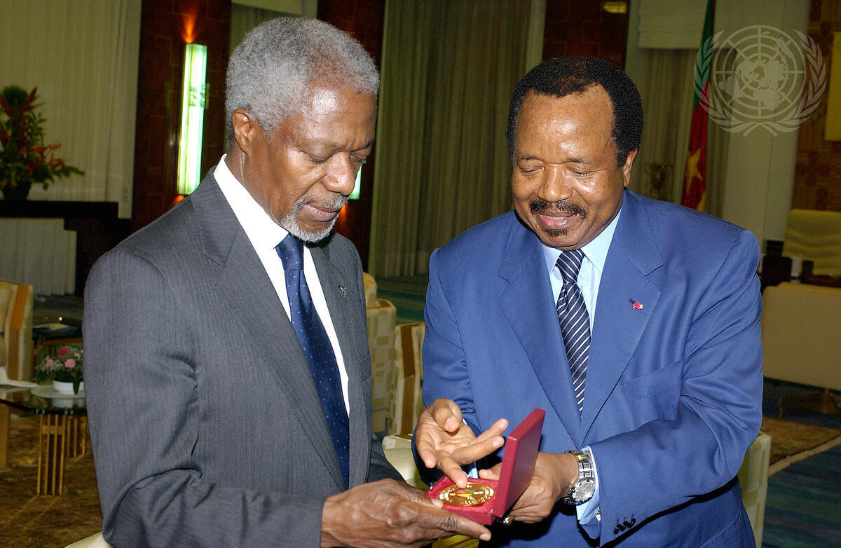 Secretary-General Kofi Annan (left) exchanges gifts with Paul Biya, President of the Republic of Cameroon, following their meeting at the Presidential Palace.