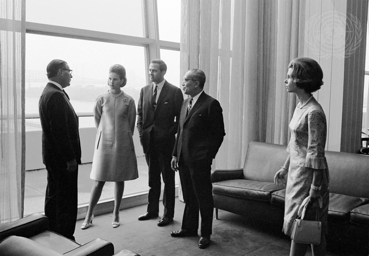 Mr. P. de MEULEMEESTER (left), Queen ANNE-MARIE, King CONSTANTINE (second and third from left) and Princess IRENE (right) of Greece, with Secretary-General U THANT (second from right) in the North Lounge of the UN, during the visit of the King and Queen to UN Headquarters today.