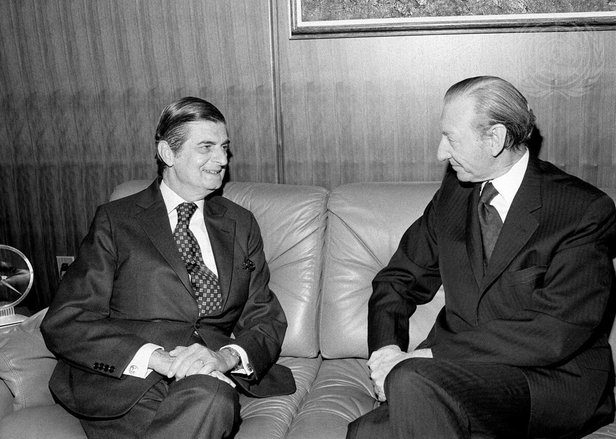 Dimitri Bitsios, (left) Minister for Foreign Affairs of Greece, is seen as he met with Secretary-General Kurt Waldheim at United Nations Headquarters today. Mr. Bitsios is here to attend the thirtieth session of the General Assembly.