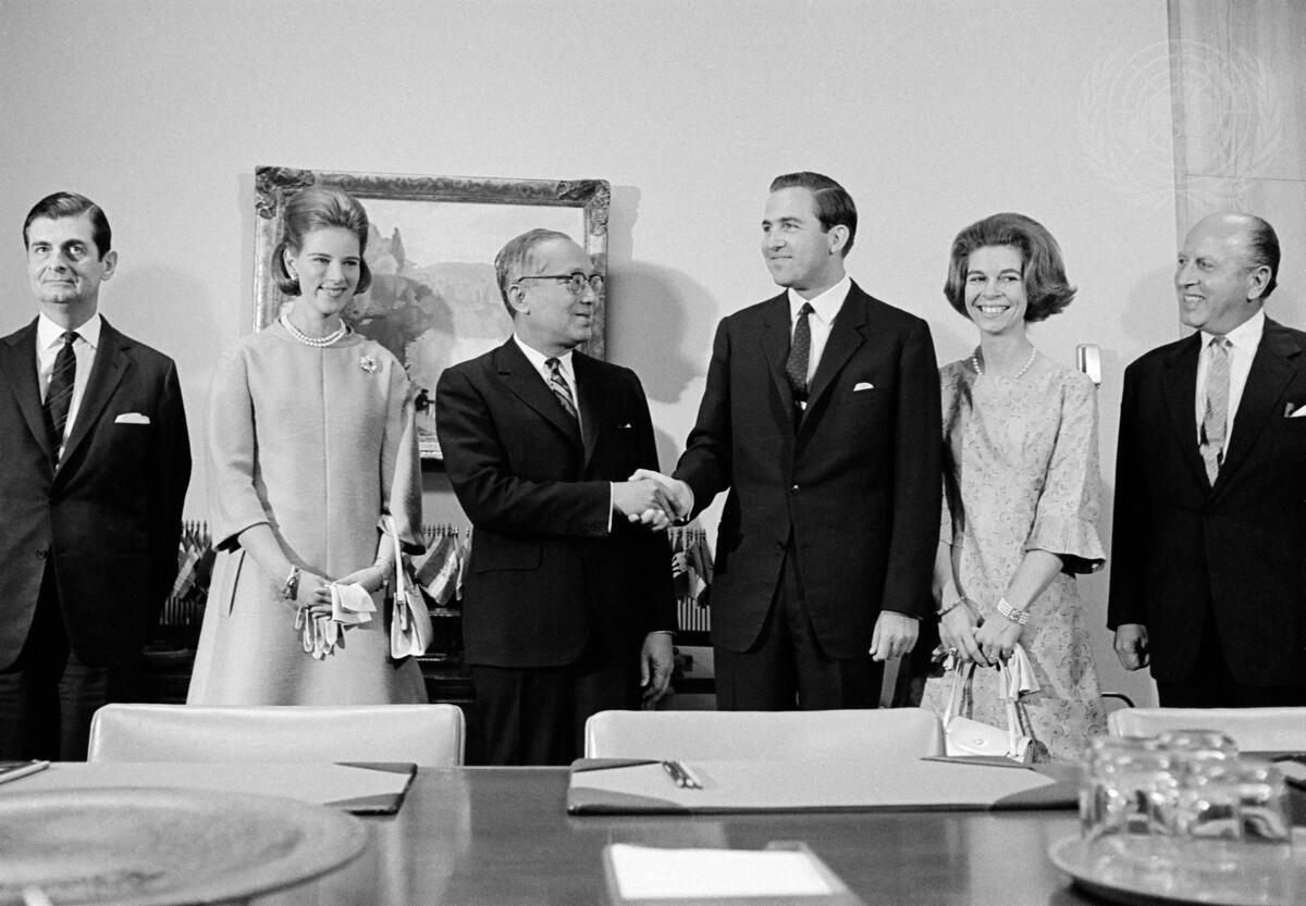 Seen here in the Secretary-General's office during their visit to UN Headquarters today are Queen ANNE-MARIE (second from left), KING CONSTANTINE (third from right), and Princess IRENE of Greece. To the Queen's right, is Dimitri S. BITSIOS, Permanent Representative of Greece to the United Nations; to her left is SECRETARY-GENERAL U THANT. To the right of Princess IRENE, is Mr. STAVROPOULOS, UN Under-Secretary of Legal Affairs.