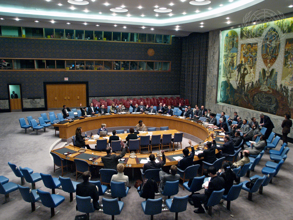 A wide view of the Council chambers. The Security Council met this morning and unanimously adopted resolution 1578 (2004), which renews the mandate of the United Nations Disengagement Observer Force (UNDOF) until 30 June 2005.