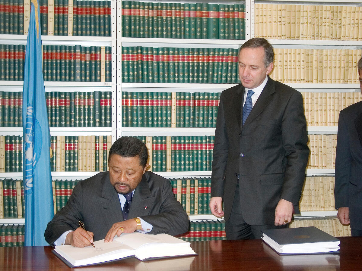 Jean Ping (left), Minister for Foreign Affairs of the Gabonese Republic and President of the fifty-ninth session of the General Assembly, signs the ""Optional Protocol to the Convention against Torture and Other Cruel, Inhuman or Degrading Treatment or Punishment"" and the ""International Convention on the Protection of the Rights of All Migrant Workers and Members of their Families""; and deposits the Instruments of Accession of the ""United Nations Convention on Contracts for the International Sale of Goods""; ""United Nations Convention on International Bills of Exchanges and International Promissory Notes""; ""United Nations Convention on the Liability of Operators of Transport Terminals in International Trade""; ""Agreement to Establish the South Centre""; ""United Nations Convention on Independent Guarantees and Stand-by Letters of Credit""; and the ""United Nations Convention against Transnational Organized Crime"".