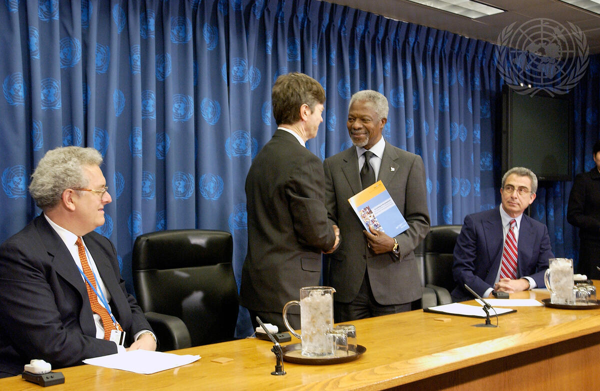 Secretary-General Kofi Annan (centre right) receives a report on the UN Millennium Project. The report, entitled ""Investing in Development: A Practical Plan to Achieve the Millennium Development Goals"", is presented to him by Jeffrey Sachs, Special Advisor to the Secretary-General on the Millennium Development Goals. Ernesto Zedillo (right), former President of Mexico and Task Force leader for the Millennium Project, and José Antonio Ocampo (left), Under Secretary-General for Economic and Social Affairs, look on.