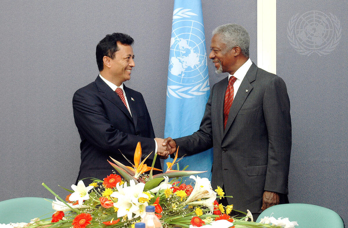 Secretary-General Kofi Annan (right) meets with Marc Ravalomanana, President of the Republic of Madagascar, during the International Meeting for the ten-year review of the Barbados Programme of Action for the Sustainable Development of the Small Island Developing States in Port-Louis, Mauritius.