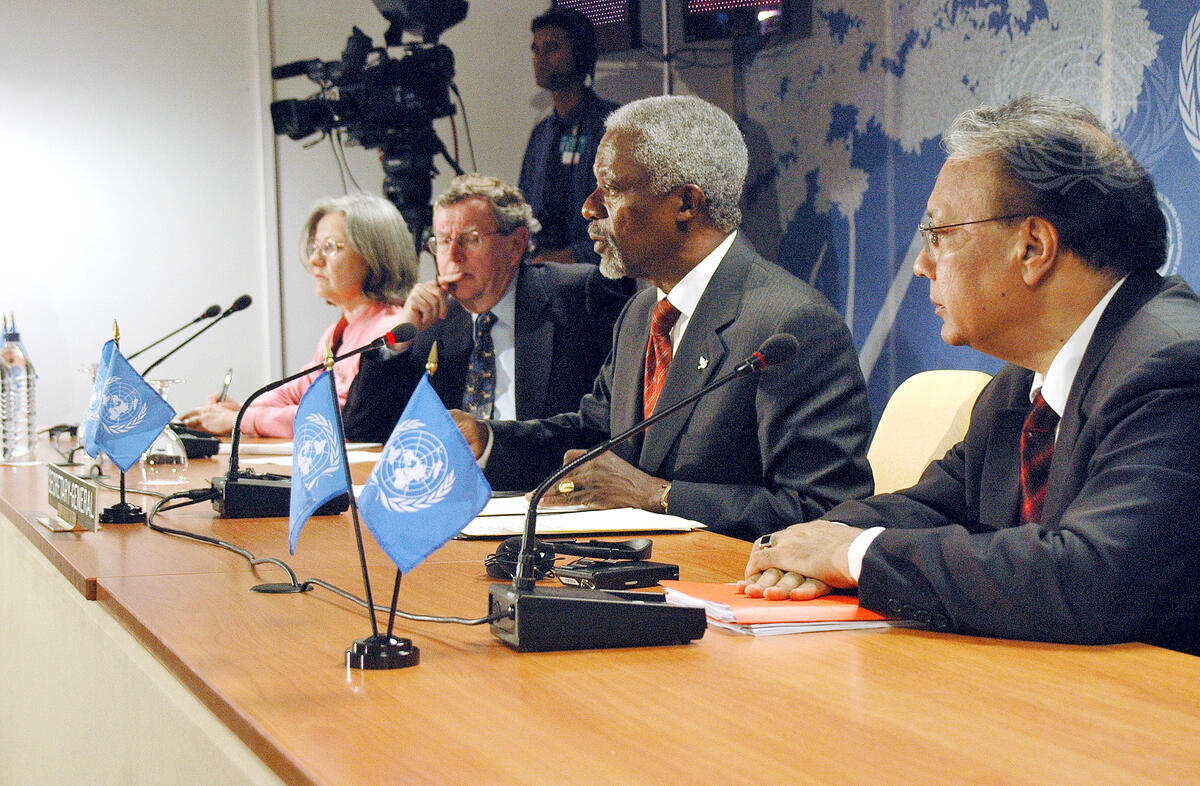 Secretary-General Kofi Annan (second from right) addresses correspondents following today's conclusion of the International Meeting for the ten-year review of the Barbados Programme of Action for the Sustainable Development of the Small Island Developing States at the Swami Vivekananda Conference Centre in Port-Louis, Mauritius.