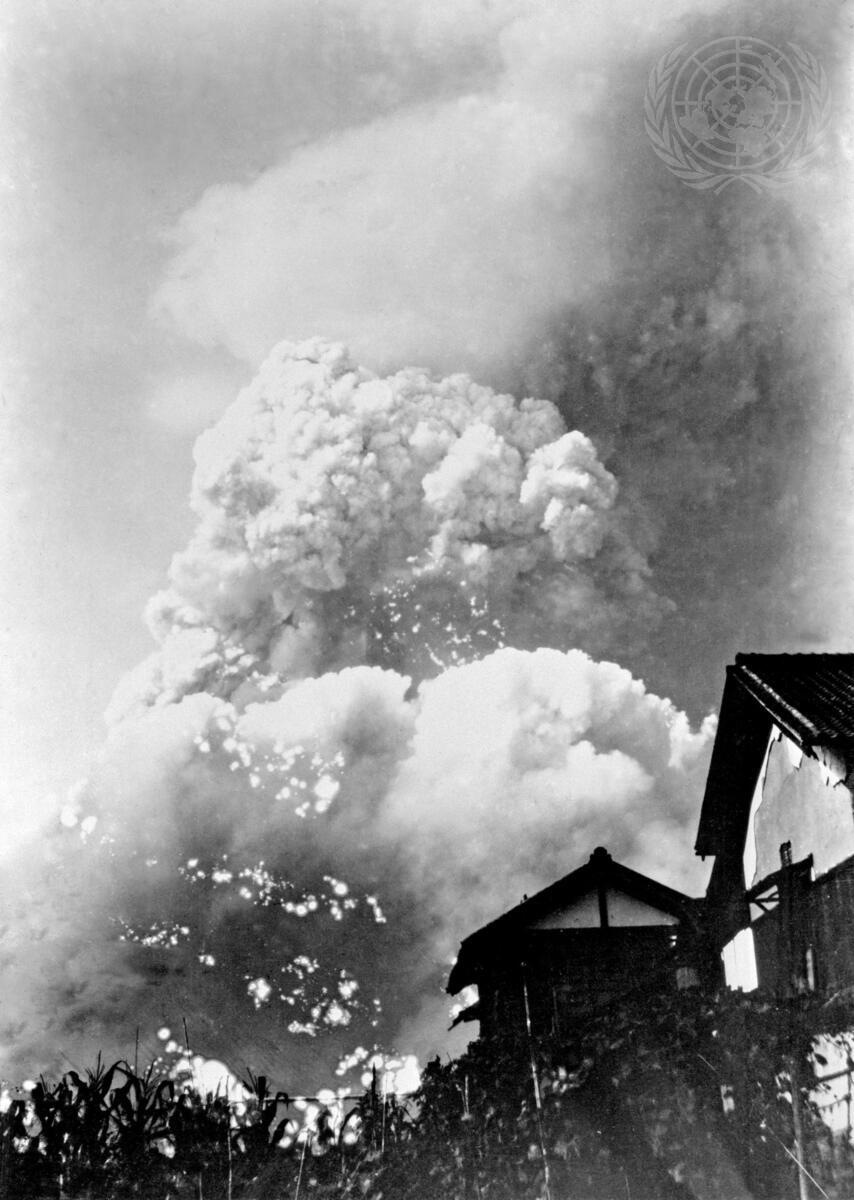 An ominous mushroom cloud rose thousands of feet into the air blotting out the sun and showering deadly ash and radioactive debris on what remained of the town and people of Hiroshima, Japan.