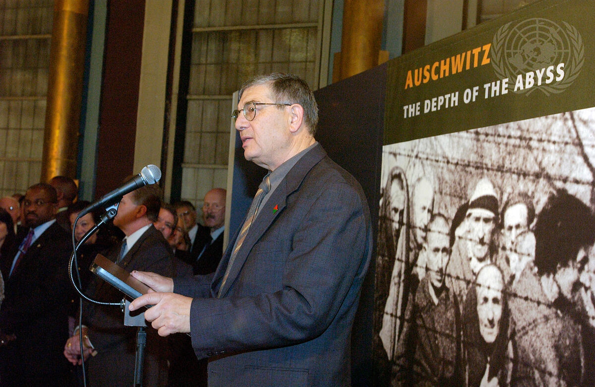 Avner Shalev, Chairman of the Yad Vashem Directorate, delivers an address during the exhibit launch.