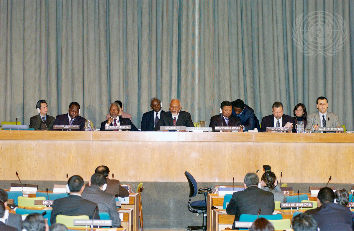 A wide view of the panel. Left to right: Zéphirin Diabré, Associate Administrator of United Nations Development Programme (UNDP); Secretary-General Kofi Annan; Keith Desmond Knight, Minister for Foreign Affairs of Jamaica; Jean Ping, President of the fifty-ninth session of the General Assembly; Stafford O. Neil, Permanent Representative of Jamaica to the United Nations; and Mourad Ahmia, Executive Secretary of the Group of 77.