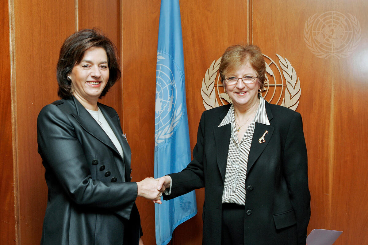 Deputy Secretary-General Louise Fréchette (right) meeting with Vasso Papandreou, Minister for the Environment, Town Planning, and Public Works of Greece.