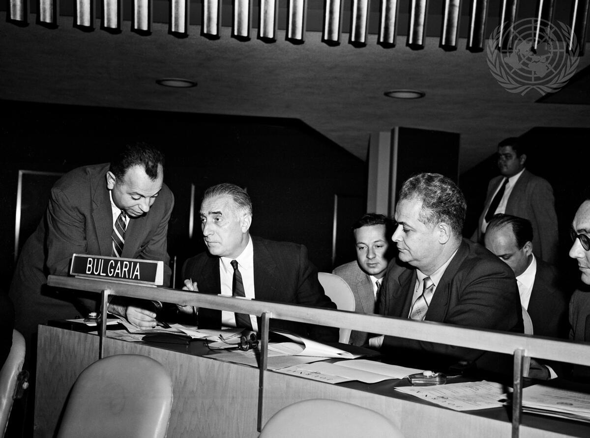 From left to right: Mr. Bogomil Todorov, of the permanent mission to the UN, adviser; Mr. Carlo Lukanov, Deputy Chairman of the Council of Ministers and Minister for Foreign Affairs, Chairman of the delegation; Mr. Vesselin Izmirliev, secretary; and Mr. Milko Tarabanov, Deputy Foreign Minister.