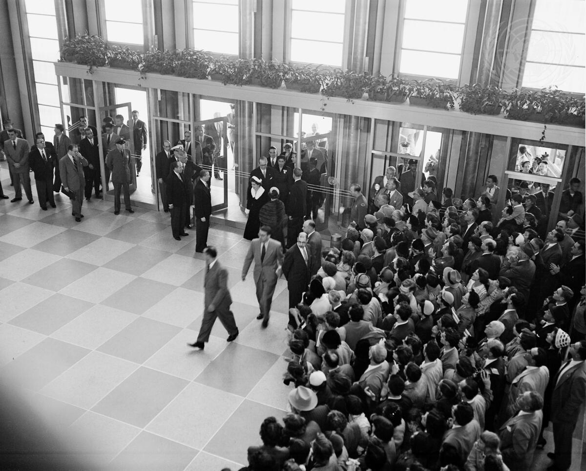The King and Queen of the Hellenes, who are at present engaged in a month-long trip in the United States, today paid an official visit to United Nations Headquarters, in New York. H. M. King Paul and H.M. Queen Frederika of the Hellenes [Greece] are seen here entering into the main lobby of the General Assembly building, at the outset of their visit.