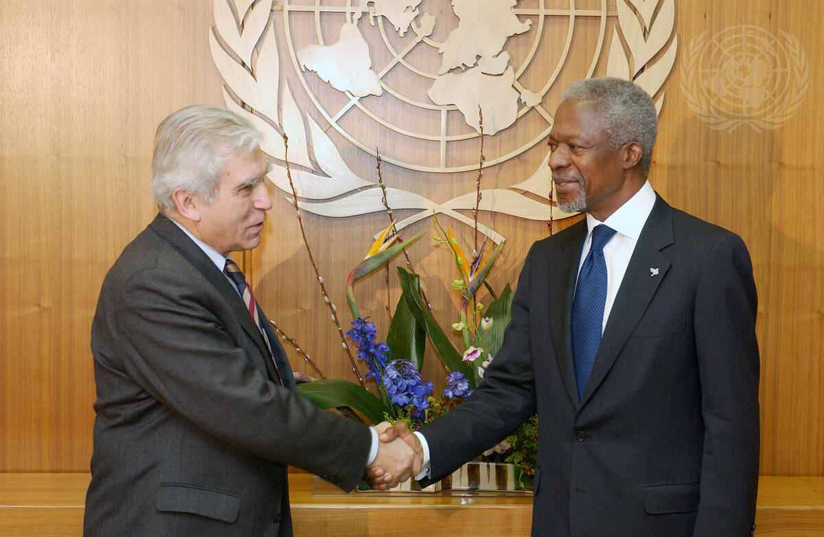 Secretary-General Kofi Annan (right) meets with Adam Daniel Rotfeld, Minister for Foreign Affairs of the Republic of Poland, today at UN Headquarters.