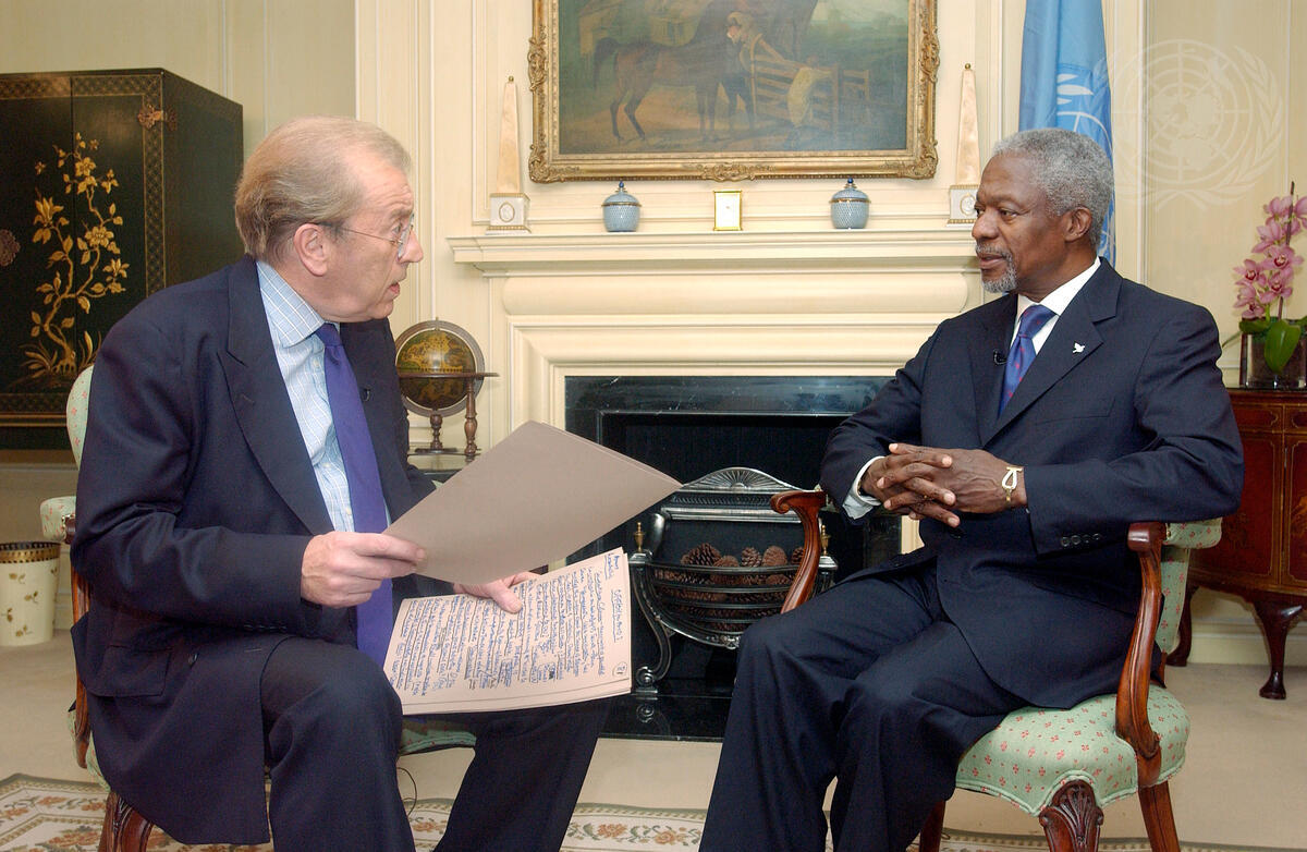 Secretary-General Kofi Annan (right) is interviewed by David Frost, host of BBC's ""Breakfast with Frost"", during his official visit to the United Kingdom of Great Britain and Northern Ireland.