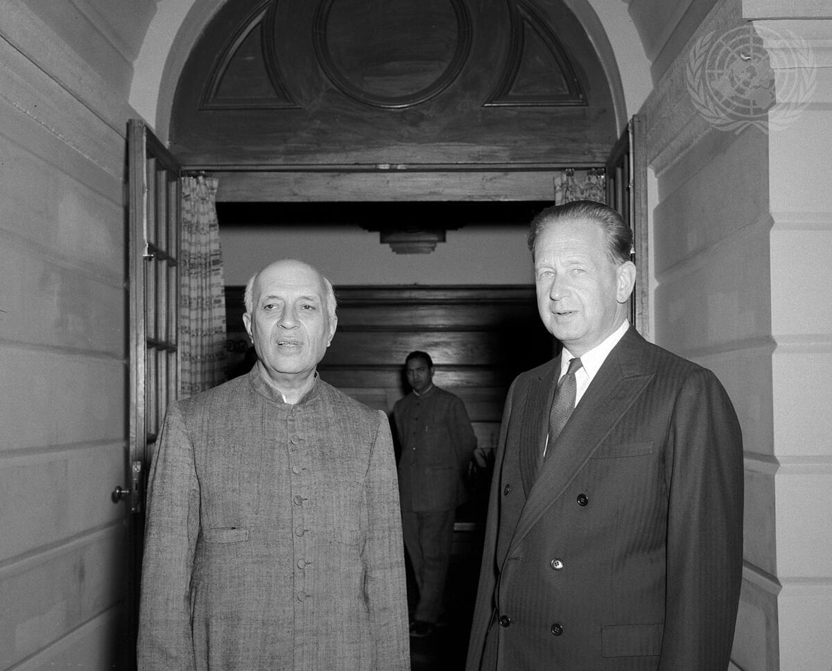 Mr. HAMMARSKJOLD was photographed with Prime Minister Jawaharlal NEHRU (left) when he called on the Indian leader today in New Delhi.