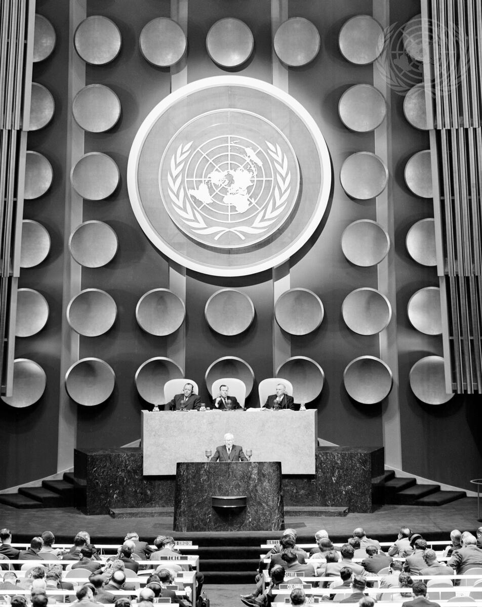 Mr. Andrei Vyshinsky, Minister of Foreign Affairs of the U.S.S.R., addressing a plenary meeting of the seventh session of the United Nations General Assembly. Seated behind him, (from left to right) Trygve Lie, Secretary-General of the U.N.; Lester B. Pearson, President of the Assembly during this session; and Andrew W. Cordier, Executive Assistant to the Secretary-General.