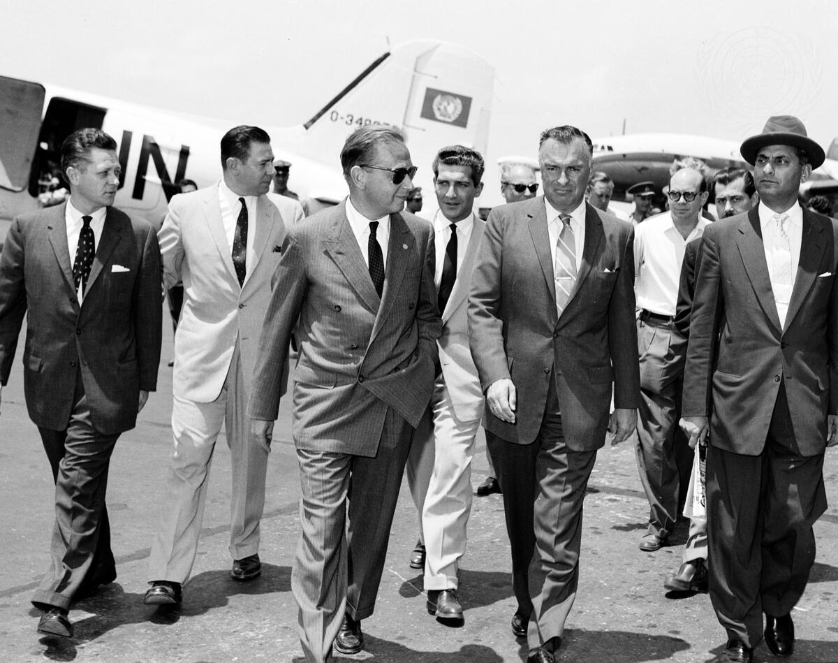 Secretary-General Dag Hammarskjöld is seen here (front row, left) at Beirut Airport with two members of the Observer Group, (left to right) Mr. Galo Plaza of Ecuador and Ambassador Rajeshwar Dayal of India.