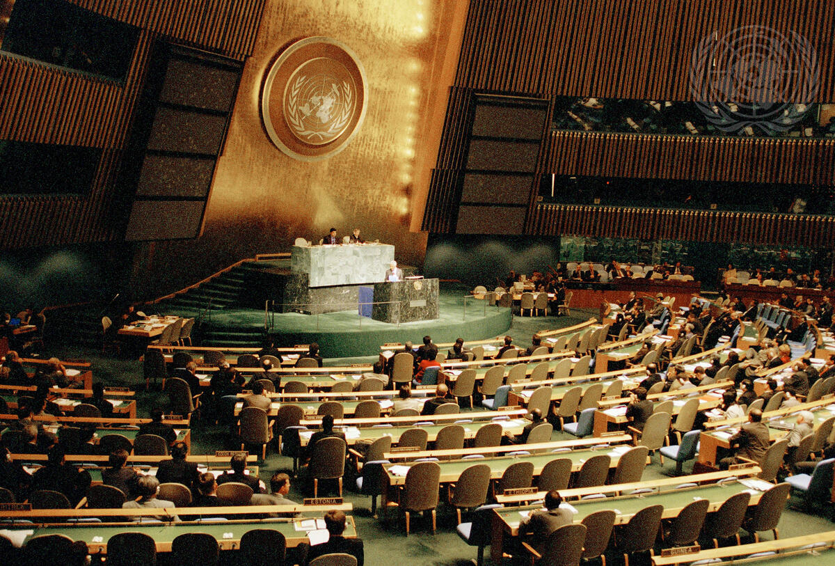 Wide view ofthe General Assembly Hall, where Secretary-General Kofi Annan is addressing the 2000 Review Conference of the Parties to the Treaty on the Non-Proliferation of Nuclear Weapons (NPT).