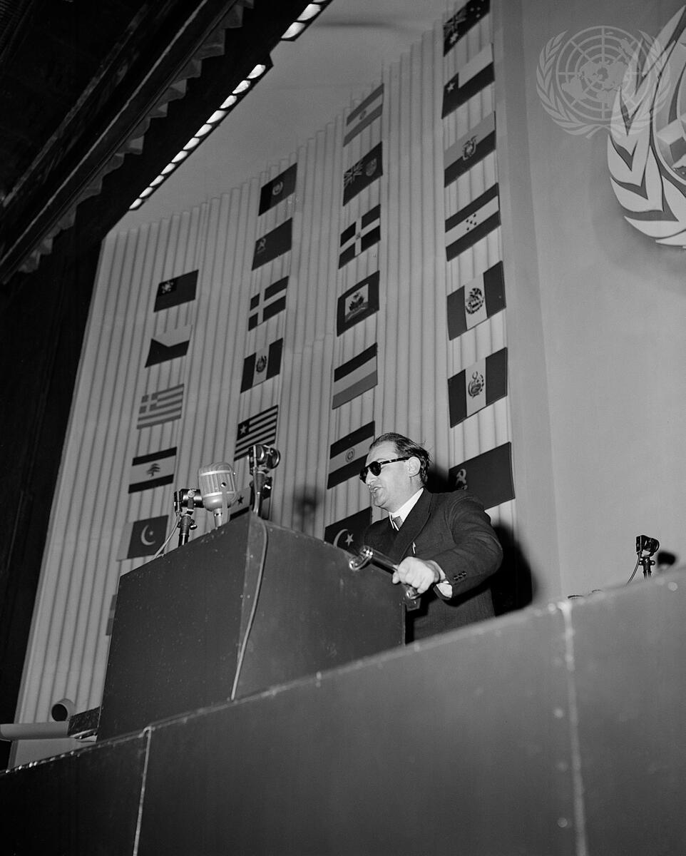Dr. Juliusz Katz-Suchy, chairman of the Polish Delegation, addressing a plenary meeting of the General Assembly which was held at the Palais de Chaillot. 1948.
