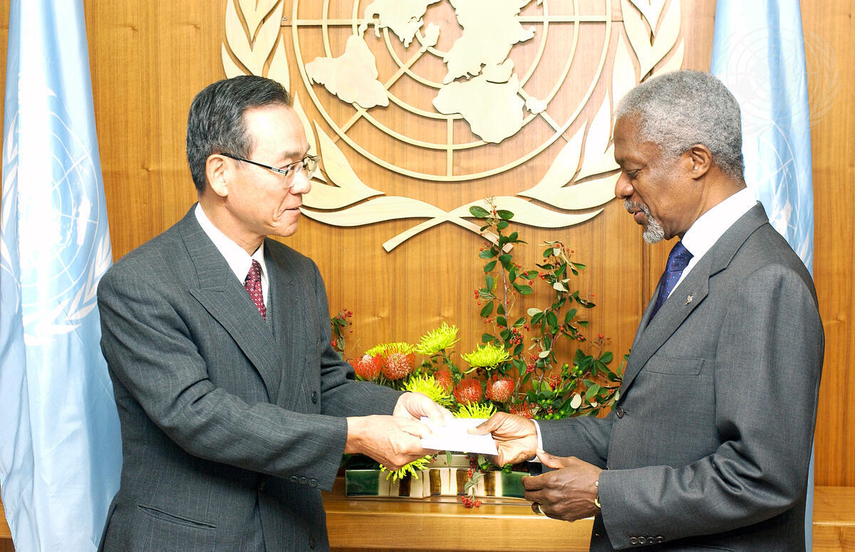 Kenzo Oshima (left), the new Permanent Representative of Japan to the United Nations, presents his credentials to Secretary-General Kofi Annan.