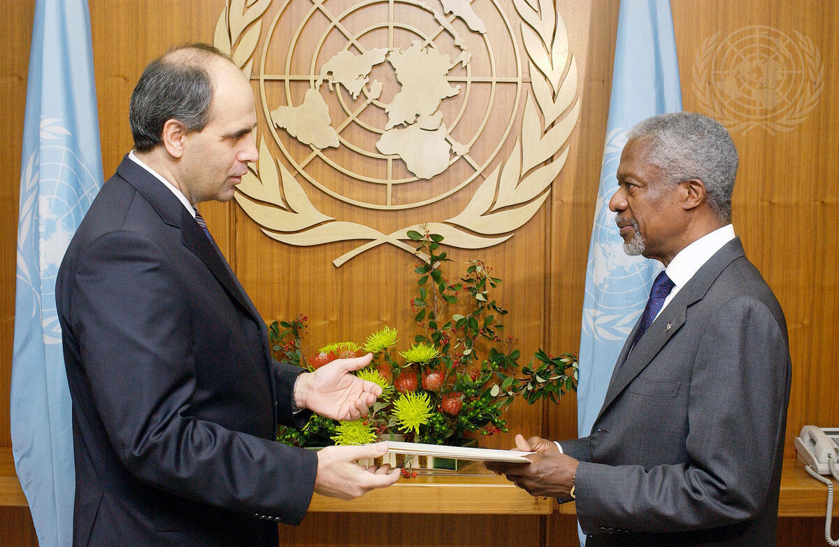 Peter Burian (left), the new Permanent Representative of the Slovak Republic to the United Nations, presents his credentials to Secretary-General Kofi Annan.