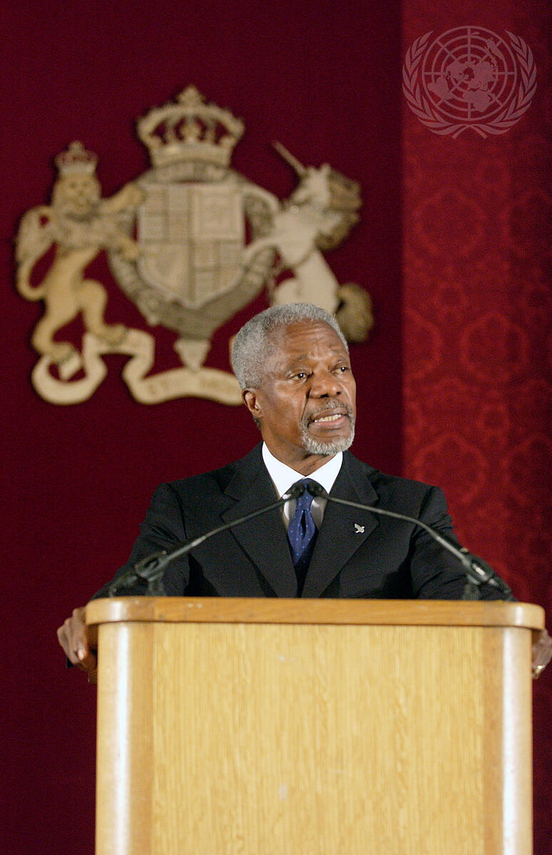 Secretary-General Kofi Annan delivers a statement at the launch of a debate on the work of the High-Level Panel on Threats, Challenges and Change, during his official visit to the United Kingdom.