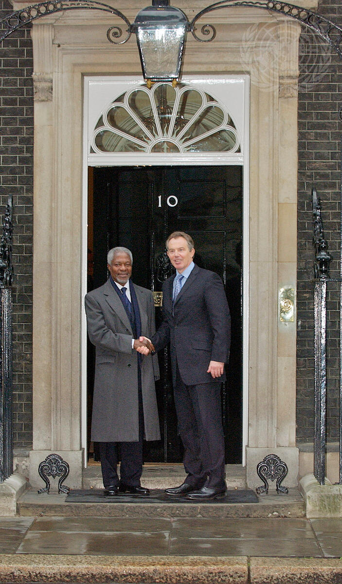 Secretary-General Kofi Annan (left) meets with Tony Blair, Prime Minister of the United Kingdom, at 10 Downing Street during his official visit to the United Kingdom.