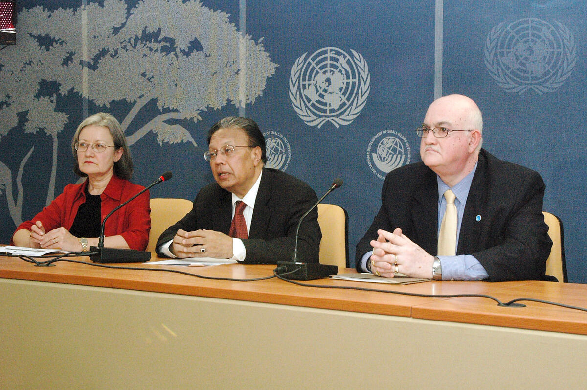 Left to right: Marie Heuze, Chief Spokesperson for the United Nations Offices in Geneva, Anwarul K. Chowdhury, Secretary-General of the International Meeting for the Ten-year Review of the Barbados Programme of Action for the Sustainable Development of the Small Island Developing States, and Rajesh Anand Bhagwan, Minister of Environment and National Development of the Republic of Mauritius, briefing correspondents on the upcoming International Meeting on Small Island Developing States.