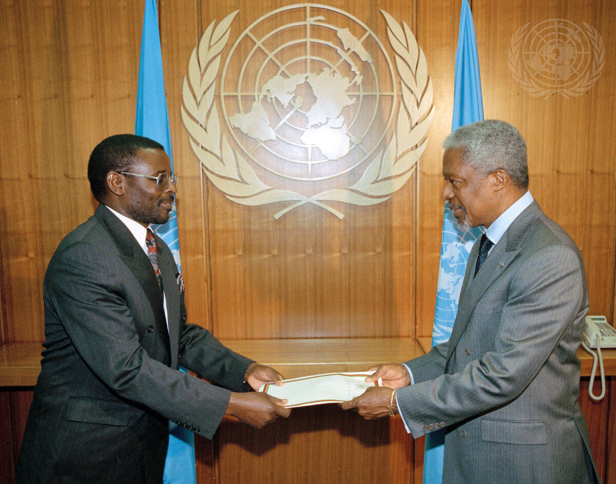 Dr. Yusuf M. Yuwayeti, the new Permanent Representative of the Republic of Malawi to the United Nations, presents his credentials to Secretary-General Kofi Annan.