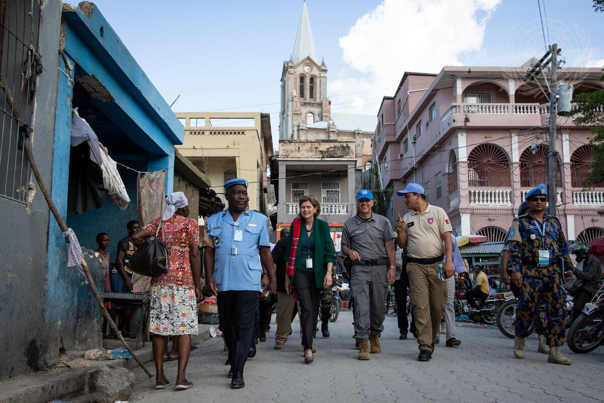 Helen Meagher La Lime (centre), Special Representative of the Secretary-General and Head of the United Nations Mission for Justice Support in Haiti (MINUJUSTH), take a walk through Miragoane with Serge Therriault, Police Commissioner at MINUJUSTH, after a visit to the base of the formed police unit (FPU) from Bangladesh and the offices of the UN Police (UNPOL) in collocation with the Haitian National Police (HNP) station.