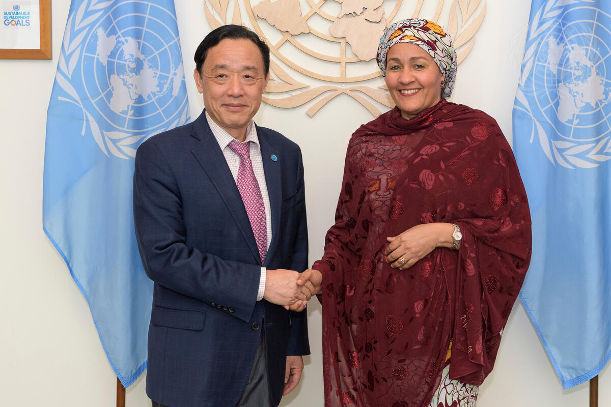 Deputy Secretary-General Amina J. Mohammed (right) meets with Qu Dongyu, Director-General of the Food and Agriculture Organization.