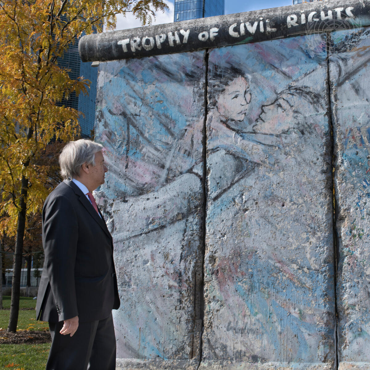 Secretary-General António Guterres stands by a piece of the Berlin Wall that stands in the garden of the UN Headquarters, ahead of the anniversary of the fall of the wall on 9 November 1989. The piece of wall was presented as a gift to the UN in 2002 from the Federal Republic of Germany.