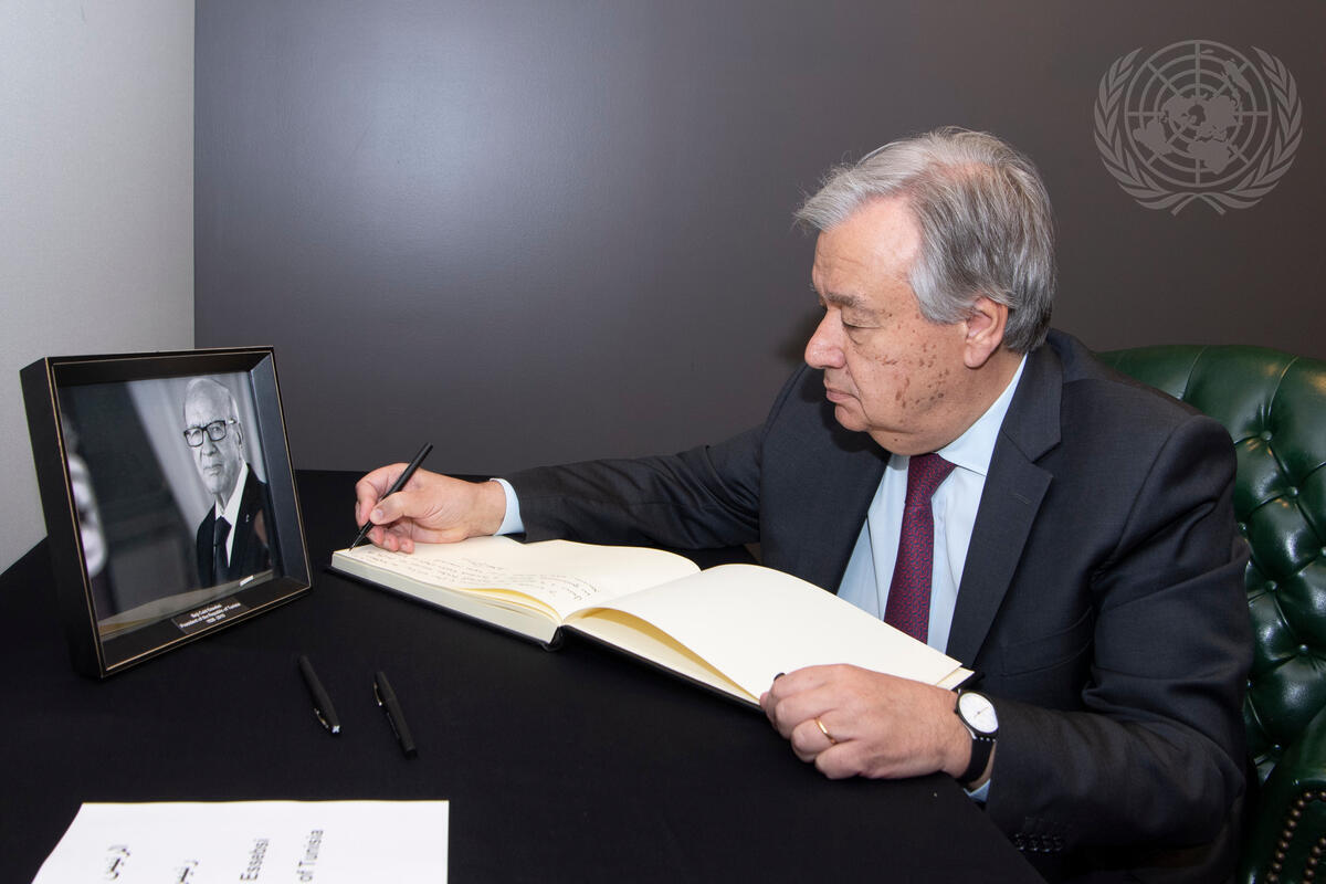 Secretary-General António Guterres signs the Book of Condolences on the occasion of the passing of Béji Caïd Essebsi, President of the Republic of Tunisia.